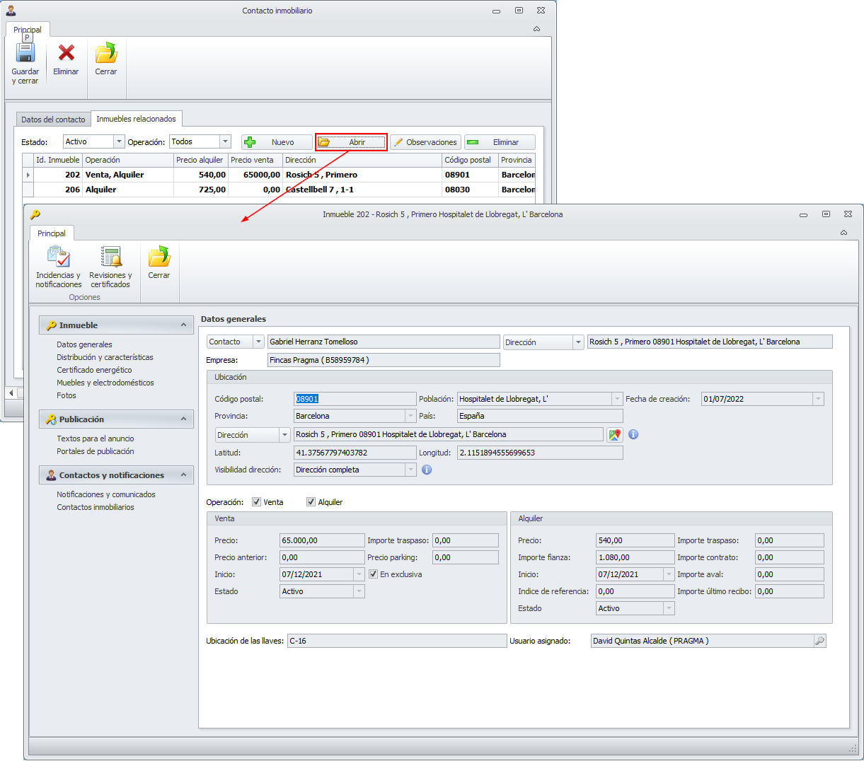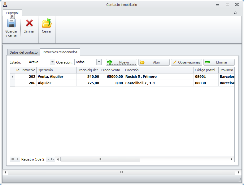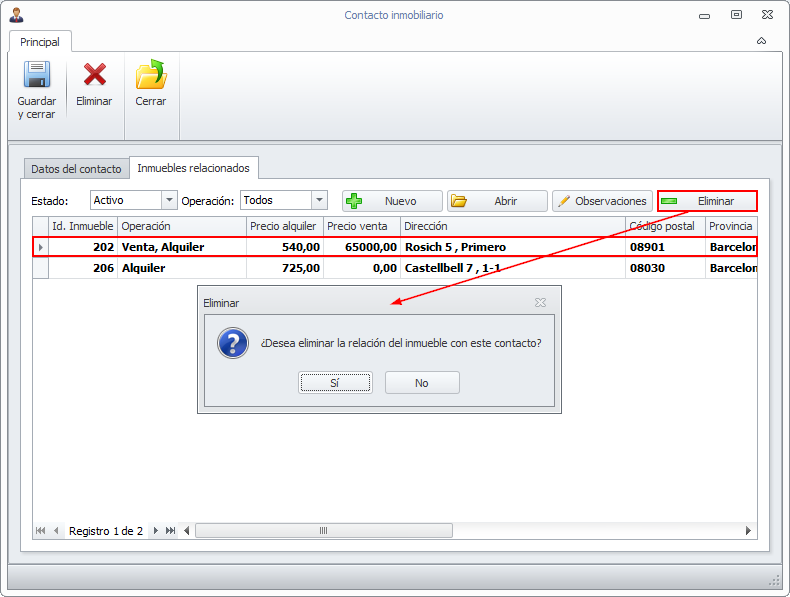 Eliminar. Quita la relación entre inmueble relacionado y el contacto inmobiliario, sin afectar a la ficha del inmueble ni a la del contacto.
