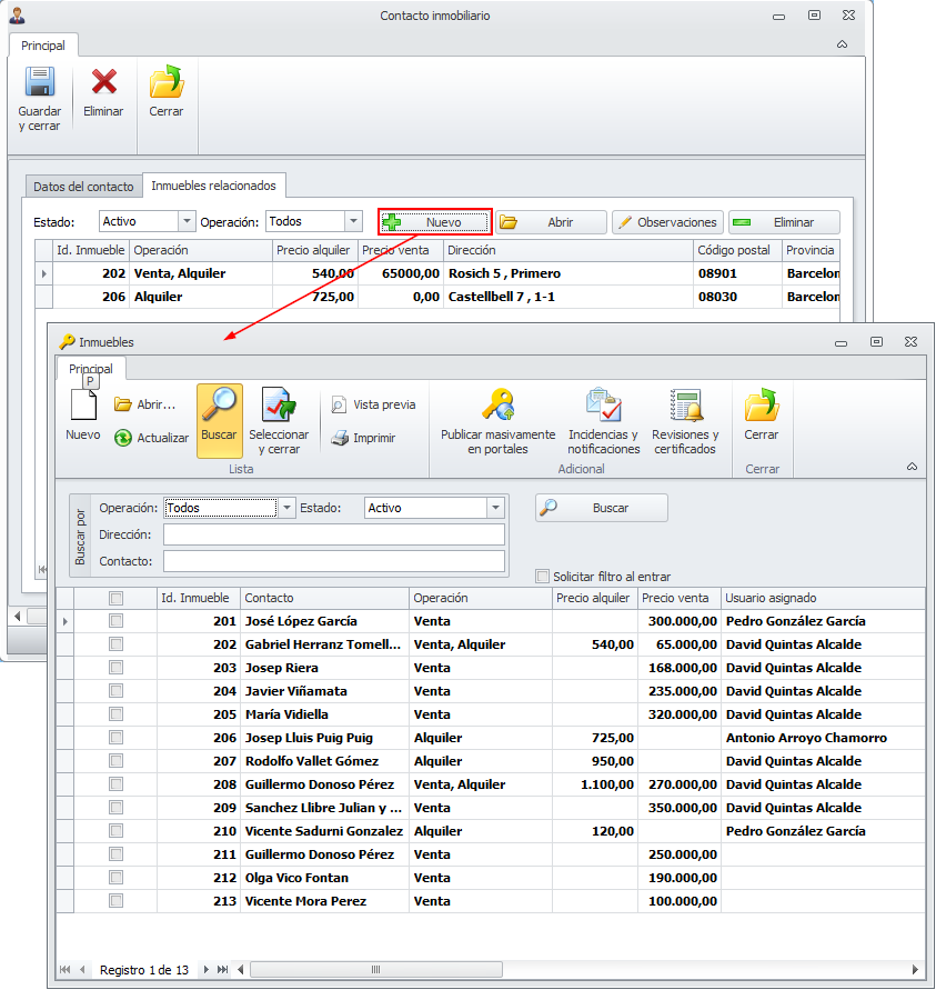 Nuevo. Este botón abre una ventana para seleccionar un inmueble y añadirlo a la lista de inmuebles relacionados.