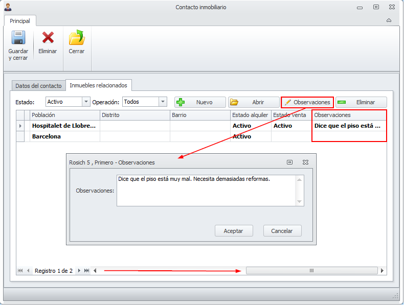 Observaciones. Muestra y permite editar las observaciones de este contacto inmobiliario con respecto al inmueble relacionado.