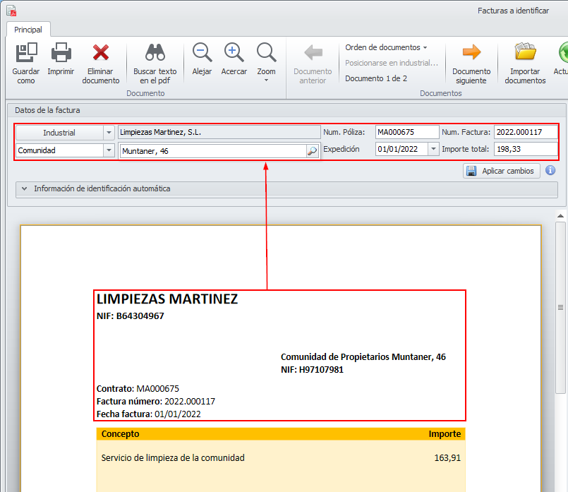Adminet puede realizar el análisis automático de facturas, únicamente desde archivos pdf de tipo documento. Los que sean archivo de sólo imagen deberán ser identificados manualmente por el usuario.