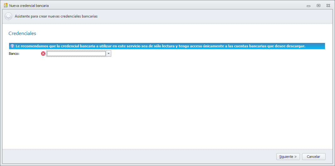 La primera ventana del asistente solicita la entidad bancaria cuyas credenciales se van a registrar.