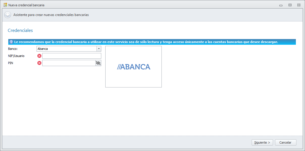 Debe informar en esta ventana los datos que utiliza para conectarse a la banca electrónica de esa entidad cuando quiere descargarse extractos.