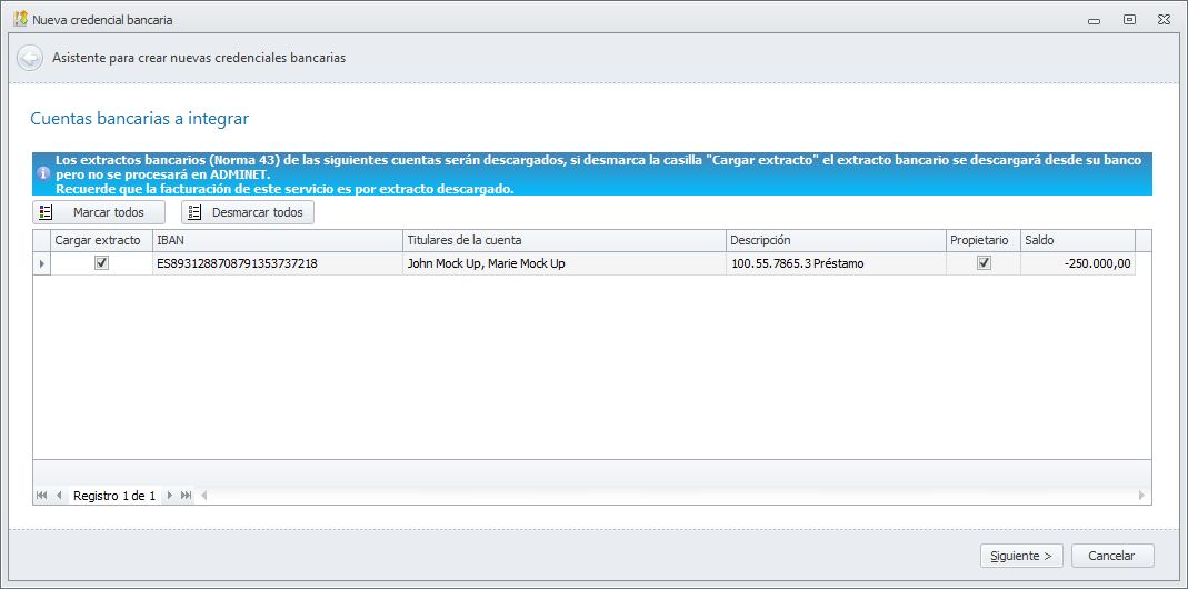Si desactiva la casilla Cargar extracto en alguna de las cuentas, el extracto será descargado de la entidad bancaria pero no será cargado en Adminet.