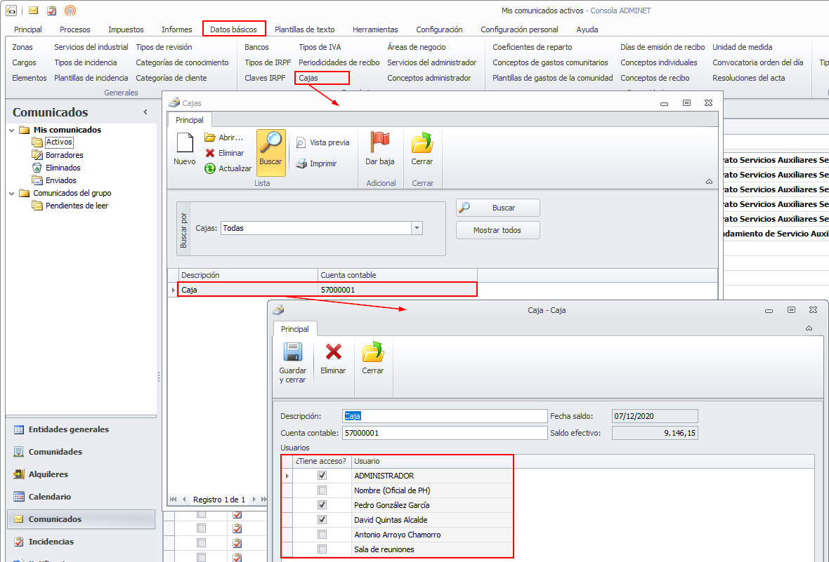 Para ello, acceda a las cajas desde el menú Datos básicos. A continuación, abra la caja que desee modificar y active los usuarios a los que quiera autorizar el acceso a esa caja.