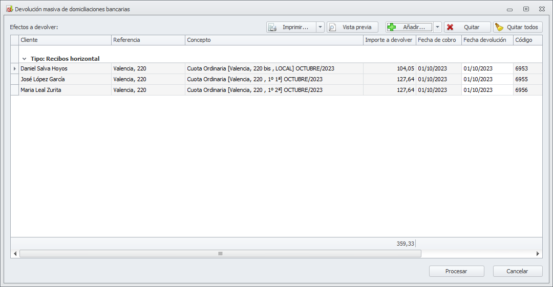 Tras la descarga, las devoluciones encontradas y procesadas son cargadas en la ventana de devolución masiva de domiciliaciones, igual que si hubiera cargado los archivos manualmente.