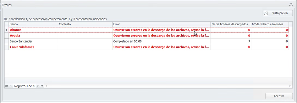 Al hacer clic en Finalizar se muestra el resumen de la descarga. En el caso de que en alguna de las entidades se haya producido algún error, lo muestra en una ventana como la siguiente.