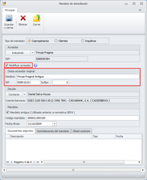 Si el acreedor original no es el mismo que el actual para este mandato, active la casilla Modificar acreedor e indique en las casillas inferiores el nombre, NIF y sufijo correspondientes al acreedor original del mandato. Estos datos serán incorporados en las domiciliaciones SEPA que se generen.