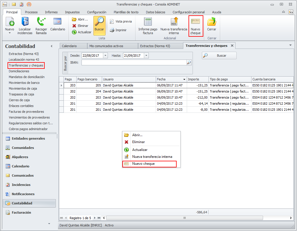 El registro de un cheque manual se inicia en la opción de menú Transferencias y cheques. Se debe hacer clic en el botón Nuevo cheque o escoger esta opción del menú que se activa con el botón derecho del ratón.