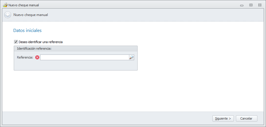 Se abre el asistente para la identificación del pago realizado. Se puede localizar el destinatario del cheque escribiendo su nombre en la casilla Referencia. Si no quiere realizar la localización por nombre, desmarque la casilla Deseo identificar una referencia y haga clic en Siguiente.