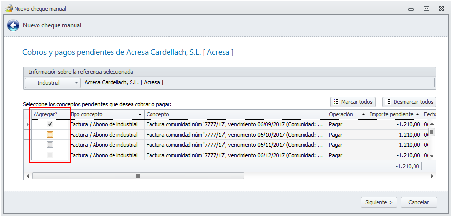 Si identifica el destinatario en la casilla Referencia, el programa localiza los pagos pendientes de ese proveedor, industrial, cliente, etc y los muestra en pantalla. En la columna Agregar debe dejar marcados aquellos pagos que van a incluirse en el cheque. Haga clic en el botón Siguiente.