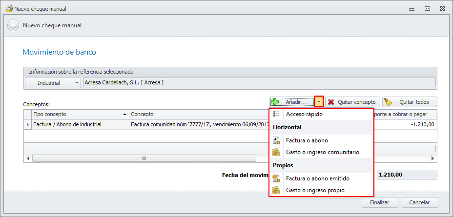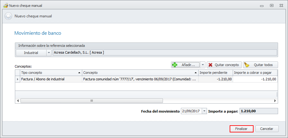 Cuando ya se han incluido todos los pagos que se incluyen en el cheque emitido manualmente, haga clic en Finalizar.