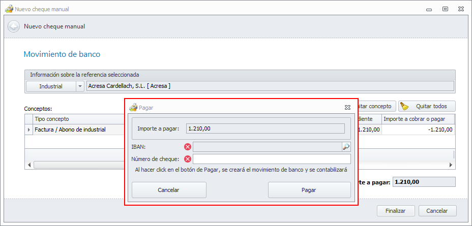 Se mostrará una ventana para que identifique la entidad bancaria la que corresponde el cheque emitido y el número del mismo. Cumpliméntelo y haga clic en el botón Pagar. En ese momento se realiza el registro en el extracto bancario del cheque y se dan por pagados los vencimientos de las facturas y gastos seleccionados.