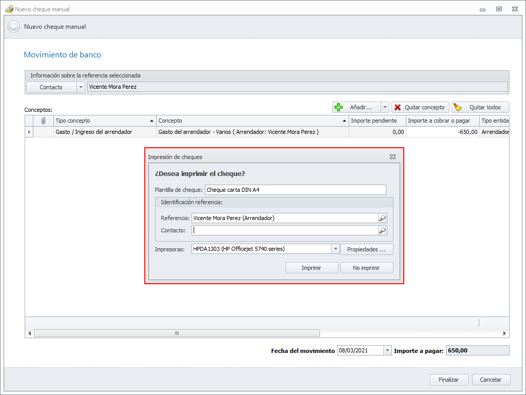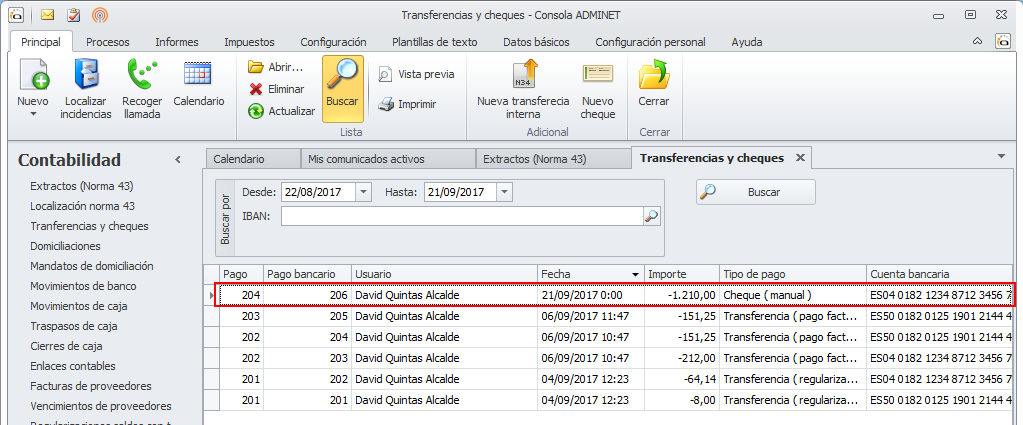 El movimiento correspondiente a este cheque será visible en el extracto bancario y en la relación de transferencias y cheques.