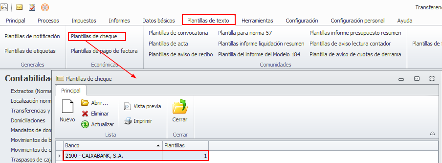 Para que se pueda imprimir el cheque debe tener configurada una plantilla de cheque para la entidad bancaria sobre la que lo esté contabilizando.