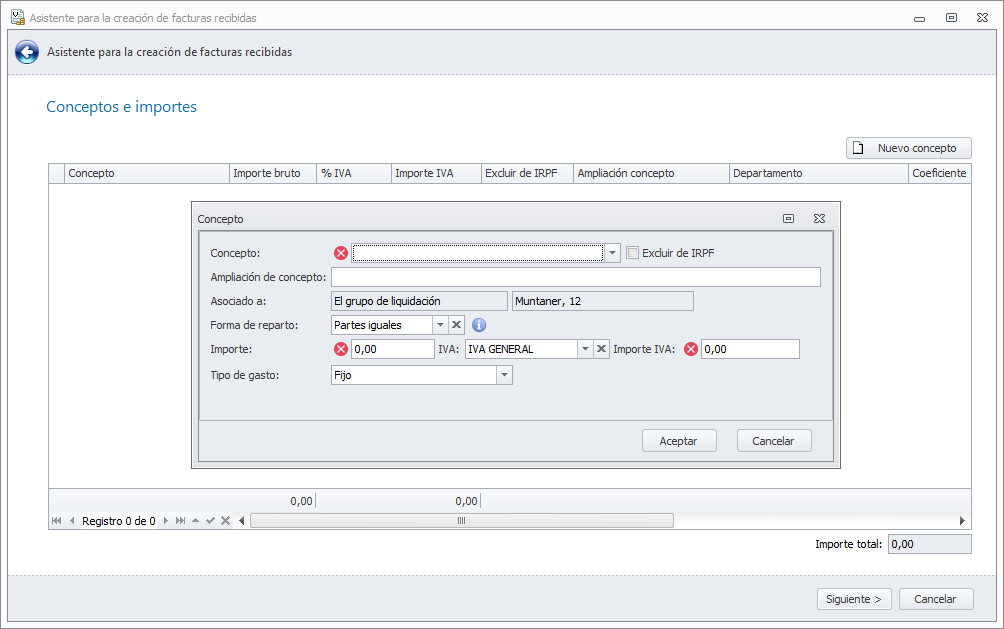Uno de los pasos del asistente de nueva factura, solicita la introducción de los conceptos de la factura.