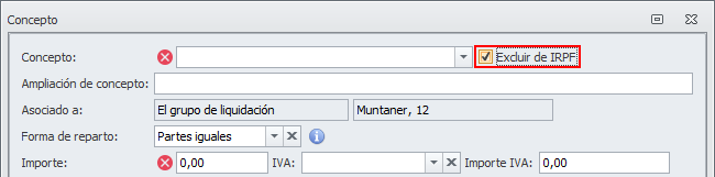 Si el industrial o proveedor tiene marcado en su ficha que aplica retención de IRPF en sus facturas, en esta misma ventana se ofrece la posibilidad de Excluir de IRPF. Si un concepto o una factura entera no aplica IVA, lo más normal es que tampoco aplique IRPF, por lo que si quita el IVA, deberá marcar esta casilla.