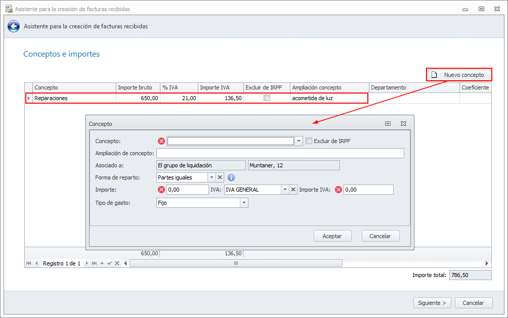Recuerde que una factura puede desglosarse en varios conceptos. Tras registrar el primero, con el botón Nuevo concepto puede añadir más.