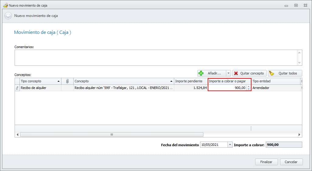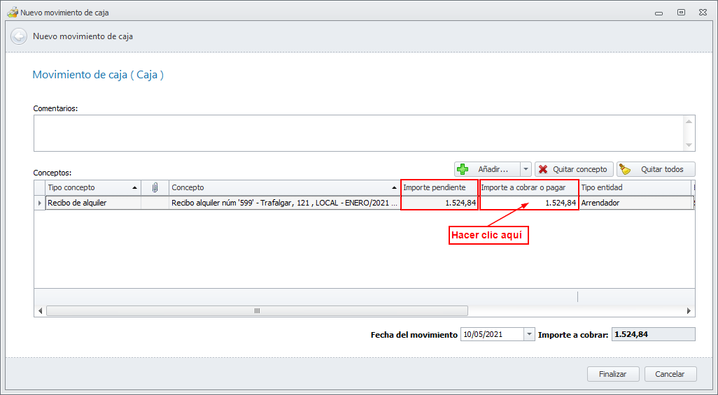 En el movimiento de caja, se indica que se desea cobrar un recibo de alquiler y se selecciona el recibo. Una vez está en pantalla, se debe hacer clic en la casilla Importe a cobrar o pagar (ver siguiente imagen).