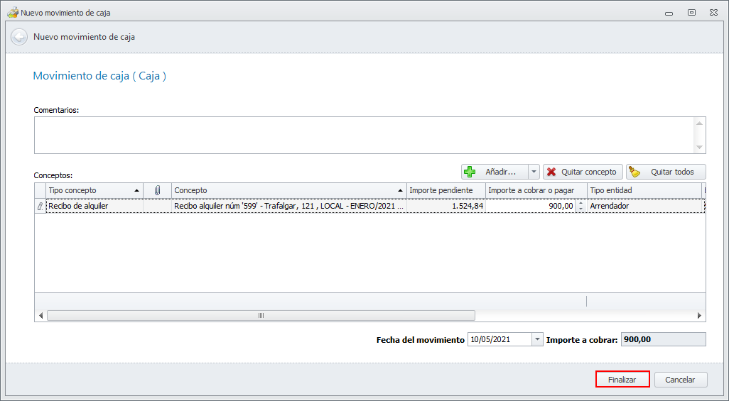 Haga clic en Finalizar y ya habrá realizado el cobro a cuenta.