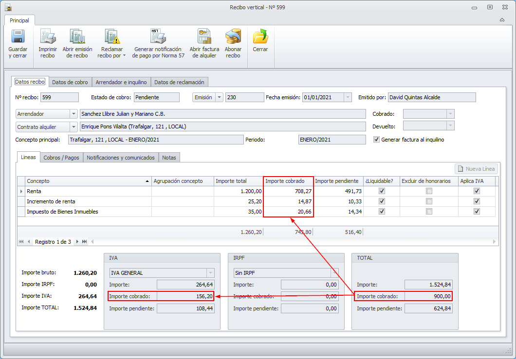 En la ficha del recibo se registra el importe total cobrado y se desglosa ese importe entre todos los conceptos del recibo de forma proporcional.