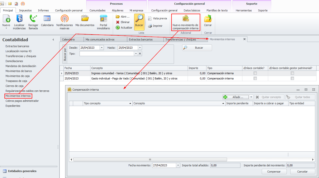 Para crear una nueva compensación interna se debe acceder a la opción Movimientos internos del apartado Contabilidad y hacer clic en el botón Nuevo movimiento de compensación interna del menú Principal.