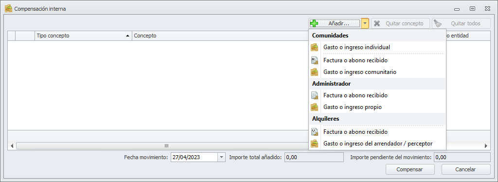 En la siguiente imagen puede ver la ficha de una compensación interna. El botón Añadir permite escoger el tipo de operaciones a registrar en esta compensación interna. Puede registrar tantas operaciones como necesite, siempre que la suma de ellas (cobros - pagos) dé como resultado cero.