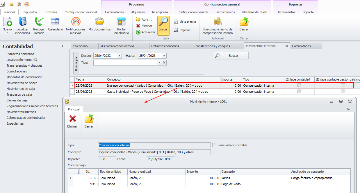 Si la primera operación de un movimiento interno corresponde a una comunidad o arrendador que se gestiona con cuenta bancaria propia, todas las operaciones de esa compensación deben tener esas mismas características.