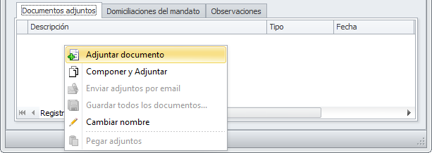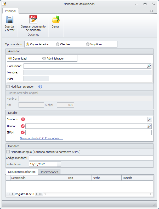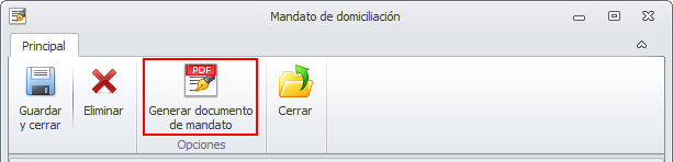 En la parte superior de la ficha dispone de un botón Generar documento de mandato que permite generar el documento para su firma.