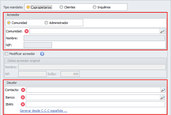 Copropietarios. Active esta casilla si el pagador de este mandato será un propietario de una comunidad o macrocomunidad, independientemente de si la comunidad se gestiona con cuenta bancaria propia o con cuenta de administrador. Al escoger este tipo, la parte central de la ventana pasa a tener este aspecto. A continuación, indique si el acreedor (el titular de la cuenta a la que se remitirá el archivo SEPA de domiciliaciones) es la propia comunidad o si es el administrador.