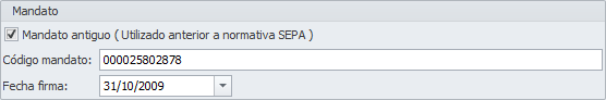 En el cuadro que muestra la siguiente imagen puede indicar que el mandato que autoriza esta domiciliación es anterior a la creación de la normativa SEPA. En este caso debe indicar el código de mandato y la fecha de la firma del mismo. Si la desconoce puede indicar 31/10/2009.