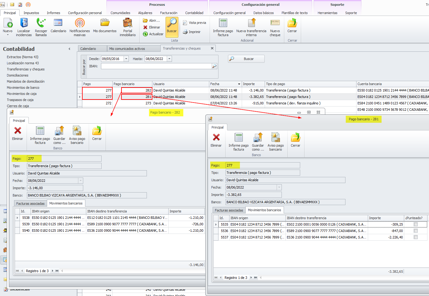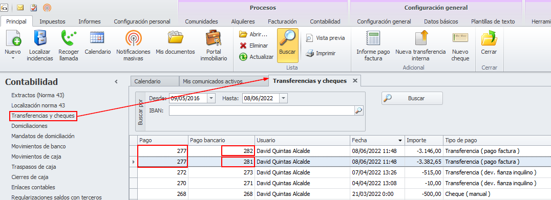 Si se administran comunidades con cuenta bancaria propia, al pagar facturas de industriales, en un mismo proceso se van a generar varios archivos de transferencias, uno por cada comunidad pagadora. Para cada archivo se creará una línea de pago bancario que contendrá, además del propio archivo, los movimientos bancarios generados y las facturas pagadas. Lo mismo ocurrirá al pagar facturas de industriales para arrendadores que tengan cuenta bancaria propia.
