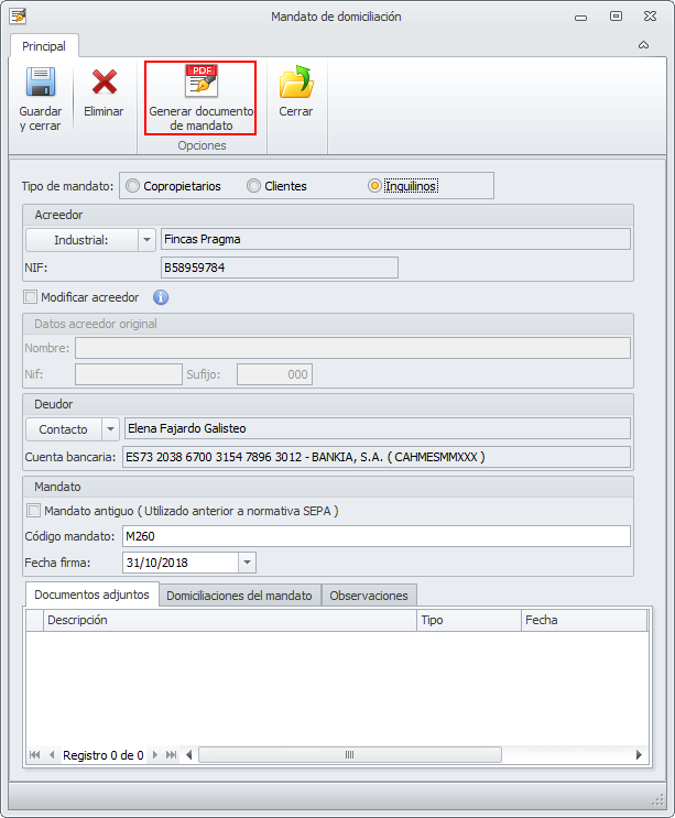 El documento del mandato se genera desde su propia ficha. Se recomienda tener la ficha cumplimentada y guardada para que el documento recoja los datos informados en él.