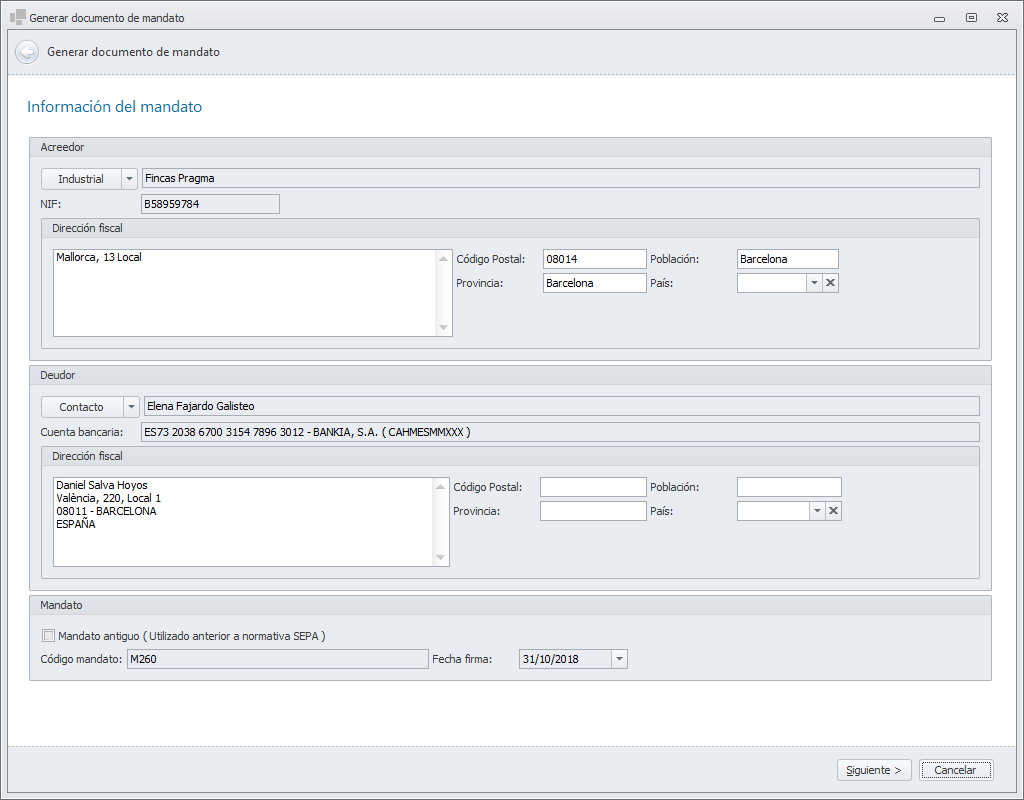 Al hacer clic en Generar documento de mandato, se abre el asistente, que muestra los datos del acreedor y del deudor. En el caso del acreedor, si es el propio administrador, se identifica como Industrial.