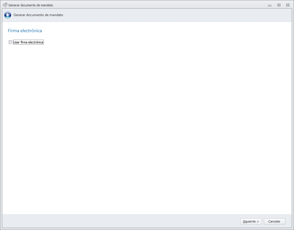 En caso contrario, déjela desactivada, haga clic en Siguiente y genere el modelo para la firma manual. Aparece esta ventana que le solicita la plantilla del mandato. Haga clic aquí para ver cómo crear y modificar plantillas de mandato.