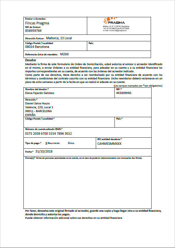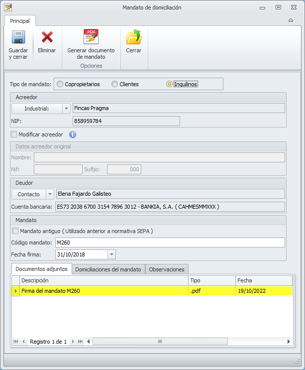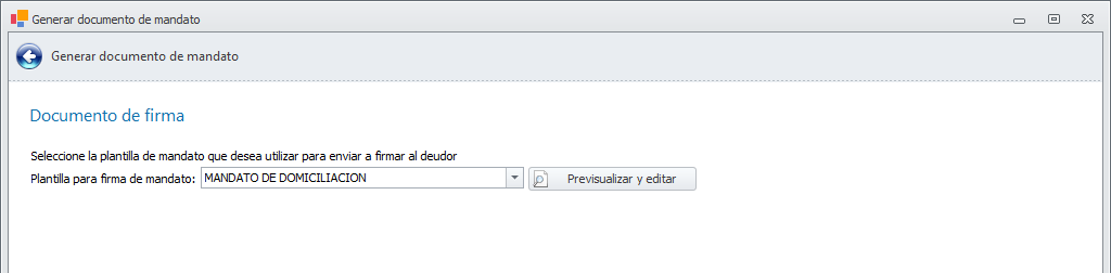 Si NO utiliza la firma electrónica, deberá remitir el documento al deudor para que lo firme y lo devuelva al remitente, tras lo cual deberá guardarlo en la misma ficha de mandato.