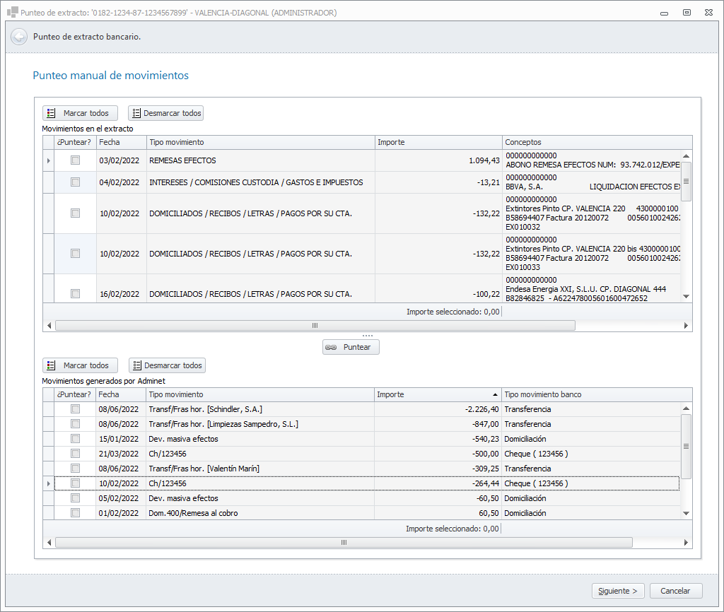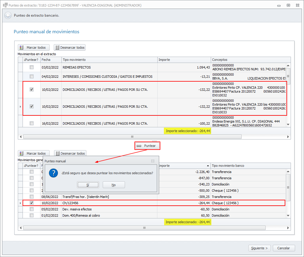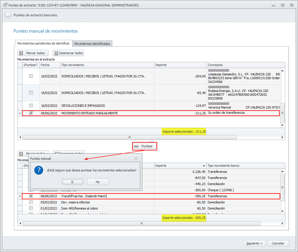Si la suma de los importes de los movimientos marcados en el extracto y en adminet coincide, al hacer clic en Puntear se pide confirmación. Si responde afirmativamente se puntean los movimientos.