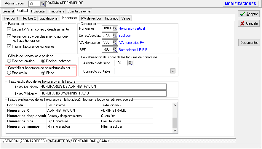 En la ficha del administador de adminis se permite escoger entre contabilizar los honorarios en la cuenta del propietario o en la cuenta de la finca.