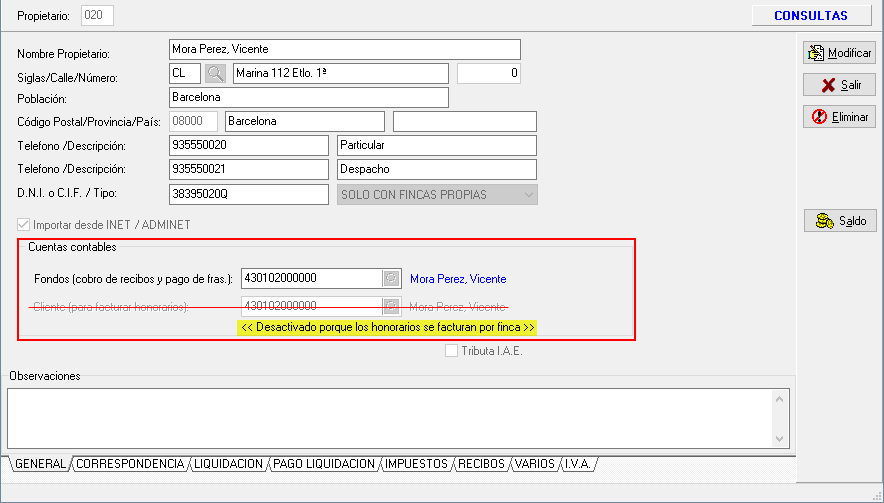 Si se indica por Finca, la ficha del propietario tiene desactivada la opción de indicar la cuenta de cliente para facturar honorarios.
