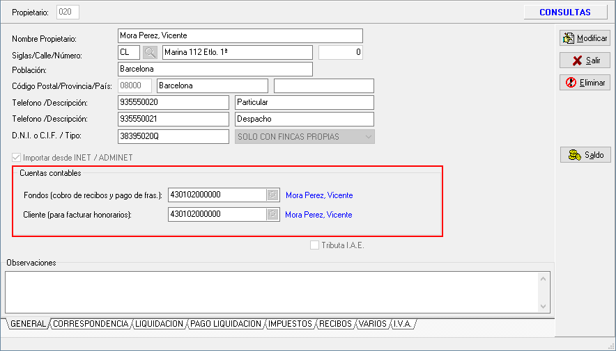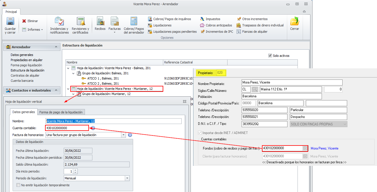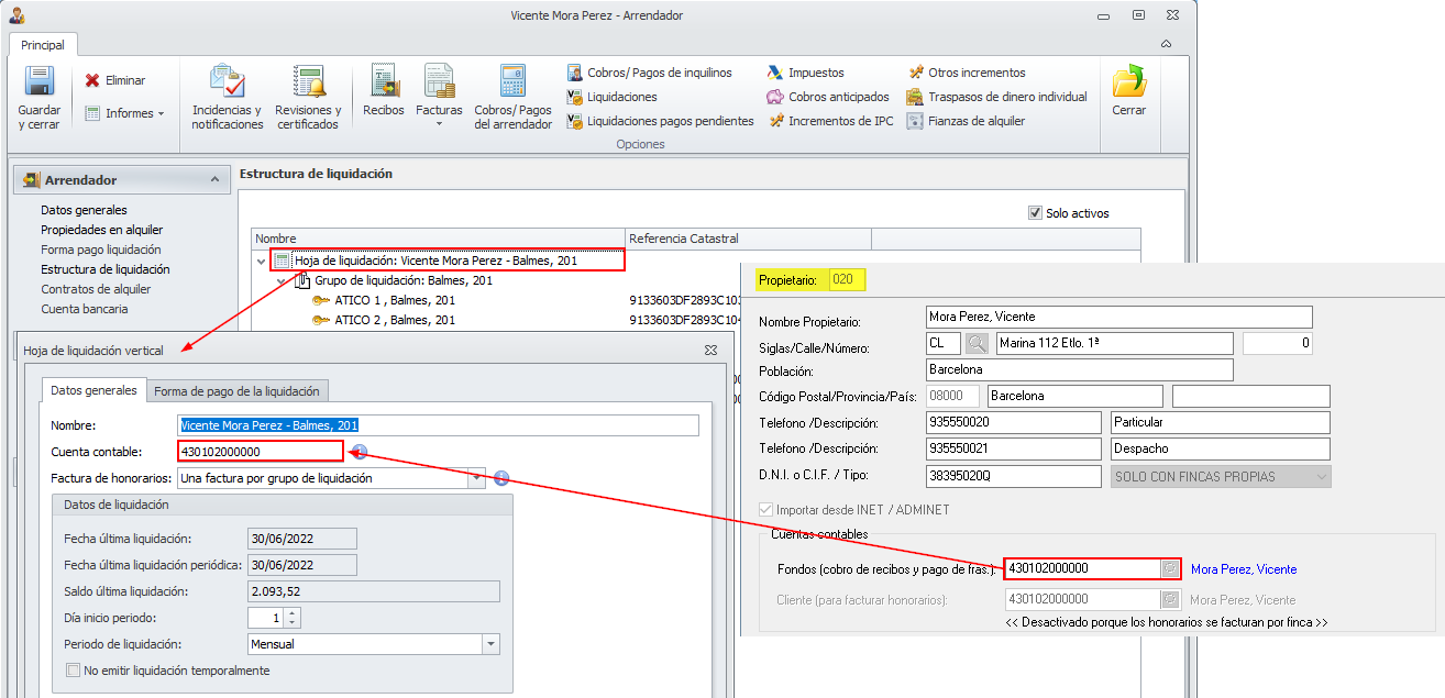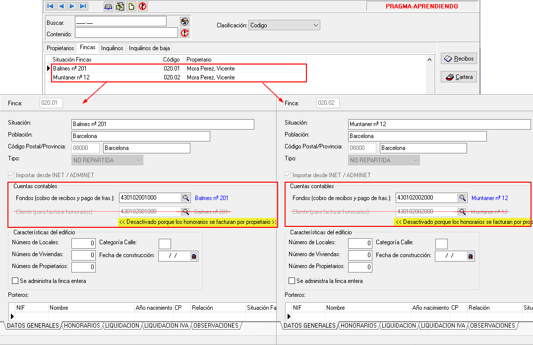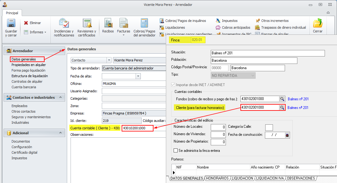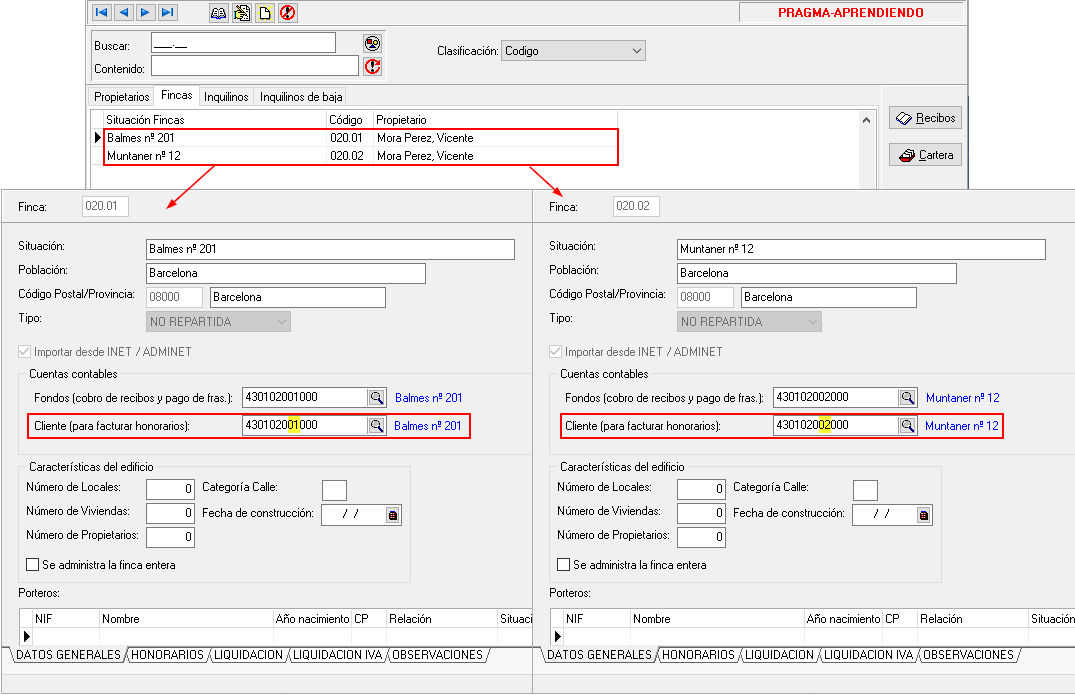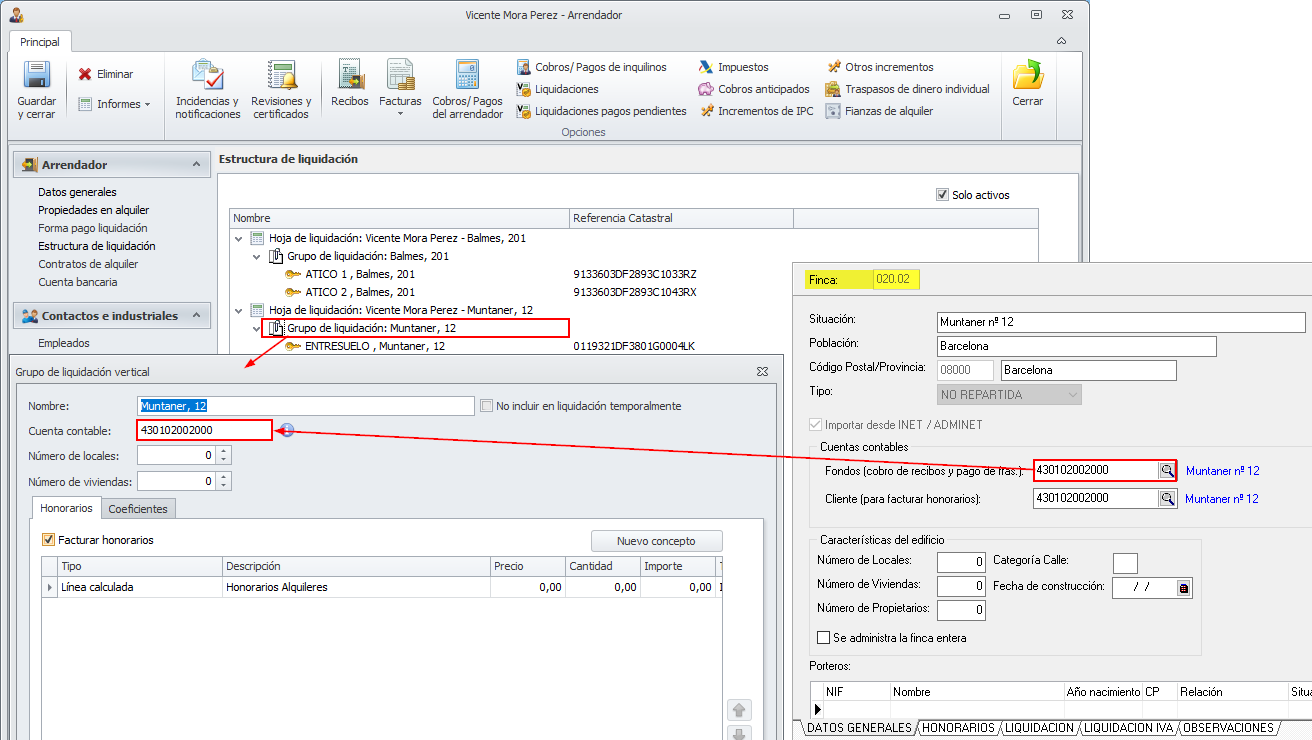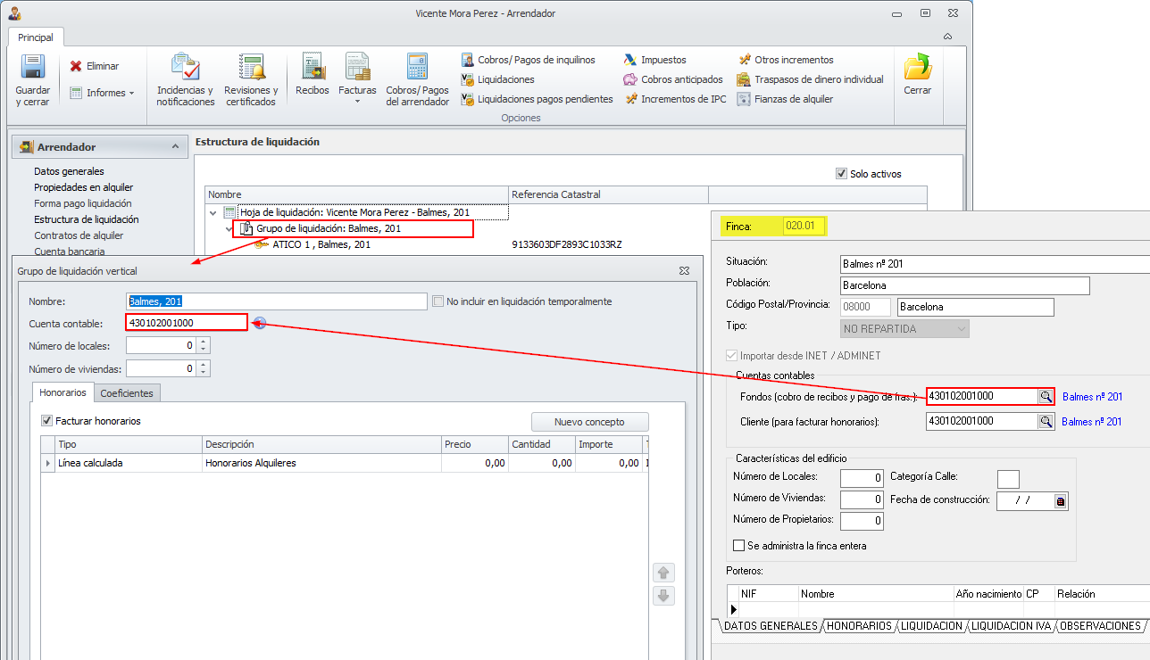 En cambio, en la ficha de cada una de sus fincas se debe indicar la cuenta de cliente dónde se facturarán los honorarios de las liquidaciones.