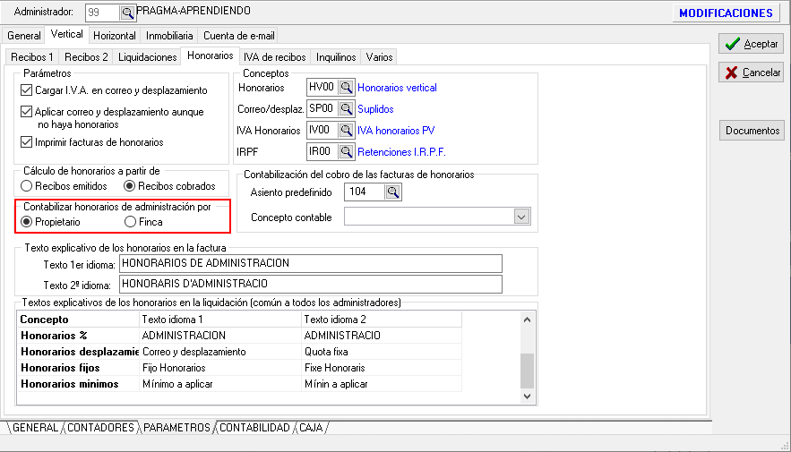 Contabilizar honorarios de administración por propietario