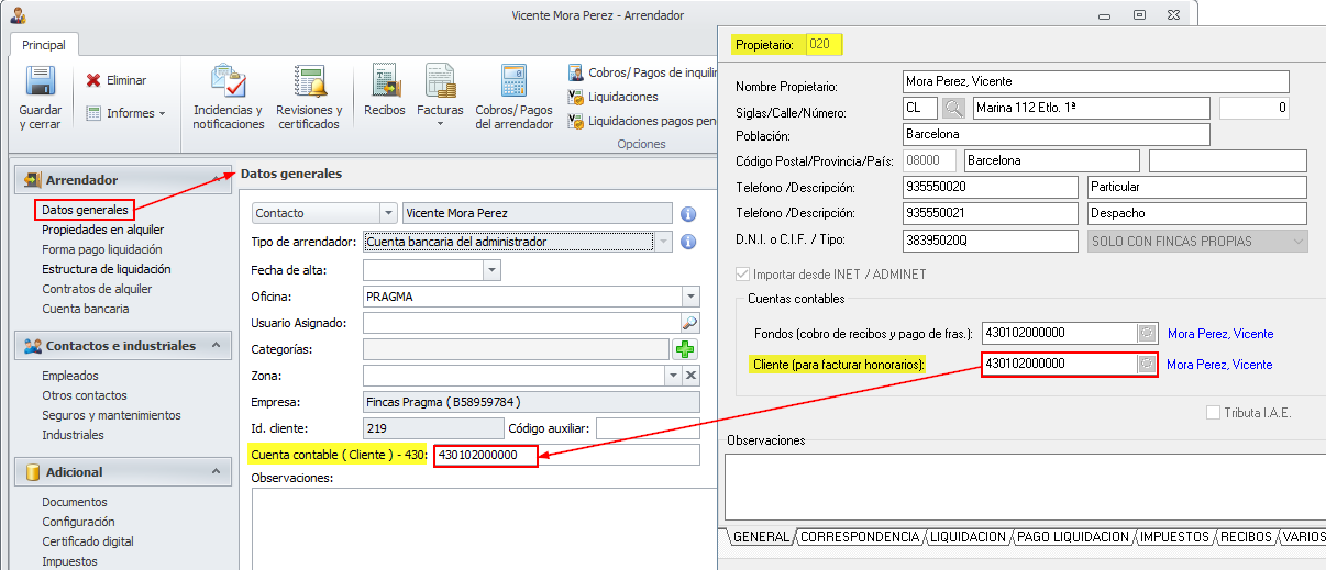 En este caso, se le asigna la cuenta de cliente indicada en la ficha del propietario de adminis.