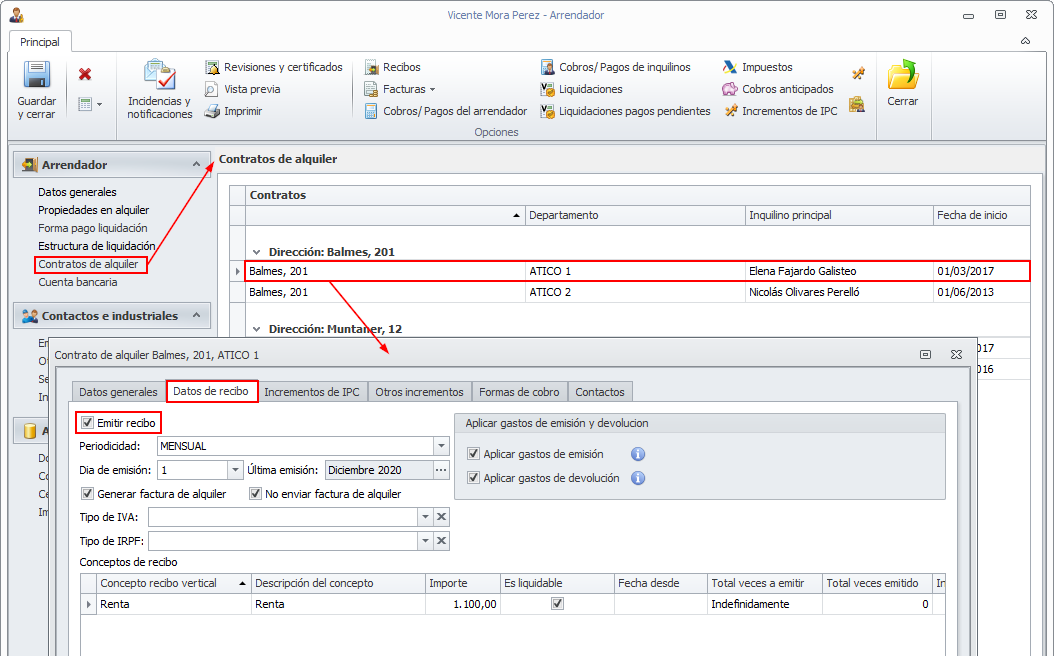 La comprobación debe realizarse accediendo a la ficha del arrendador y situándose en la sección Contratos de alquiler. Haciendo doble clic sobre un contrato se abre su ficha. En la pestaña Datos de recibo se encuentra la casilla Emitir recibo de ese inquilino.