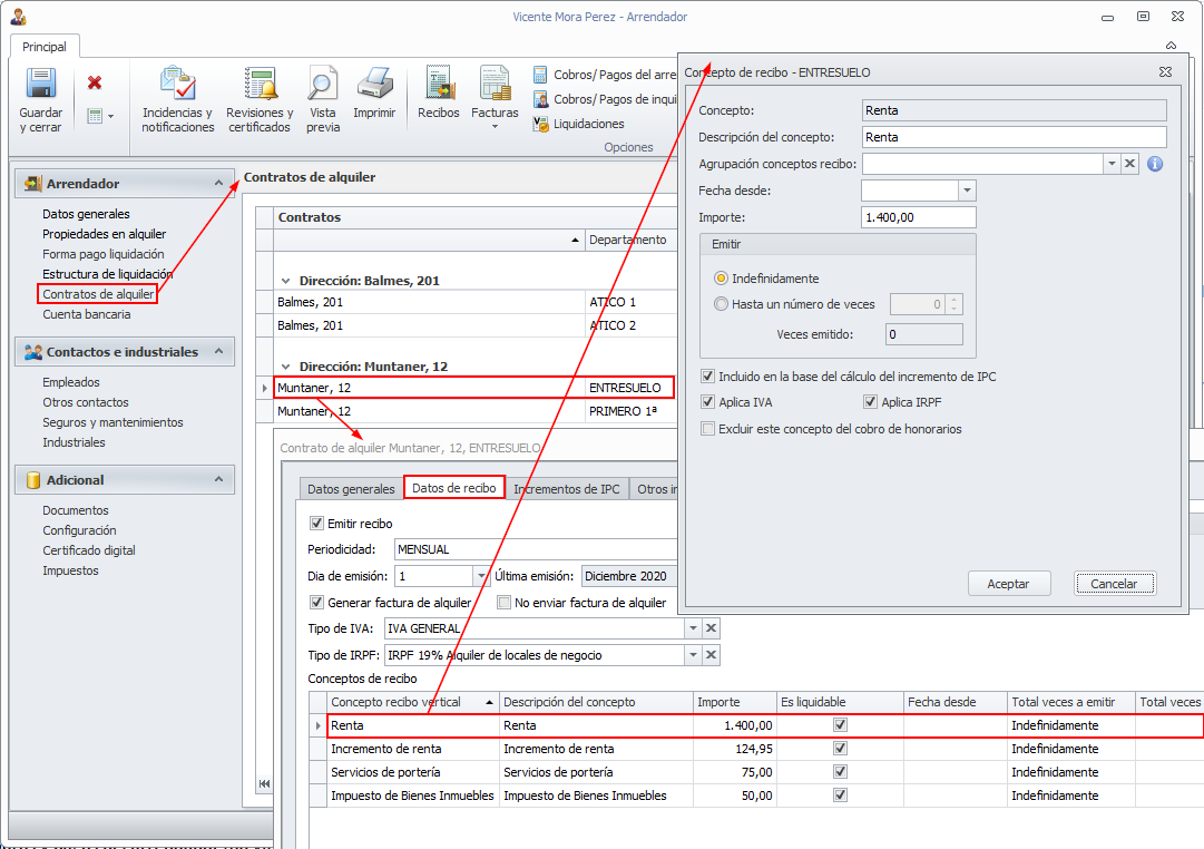 La comprobación debe realizarse accediendo a la ficha del arrendador y situándose en la sección Contratos de alquiler. Haciendo doble clic sobre un contrato se abre su ficha. En la pestaña Datos de recibo se encuentran los conceptos por los que se le cobra el alquiler. Haciendo doble clic sobre cada uno de ellos, se abre una ficha con las características de ese concepto para ese inquilino.