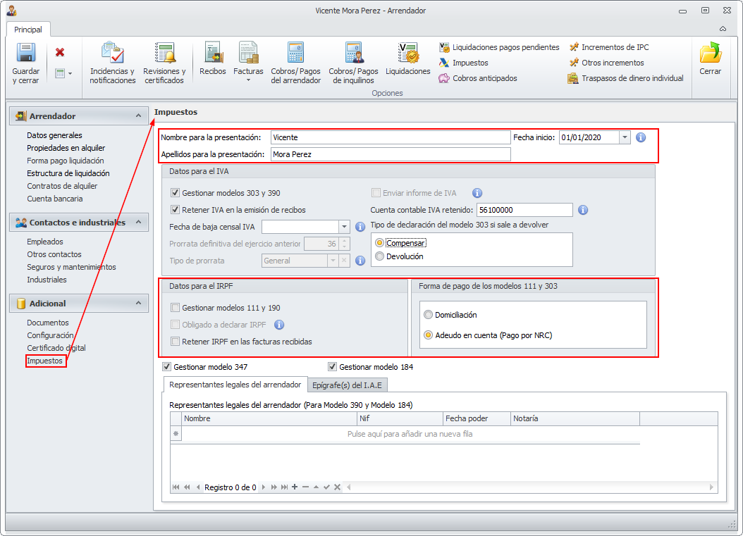 La gestión del IVA del arrendador se configura en la sección Impuestos de su ficha.