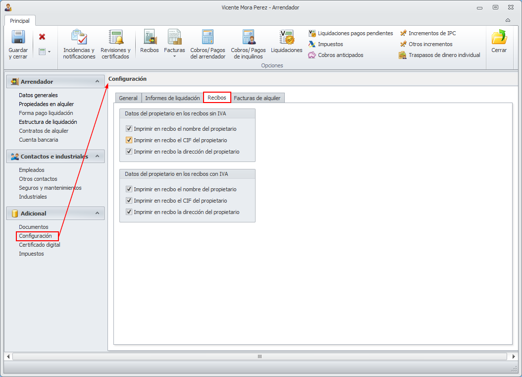 Configuración para imprimir datos del arrendador en los recibos
