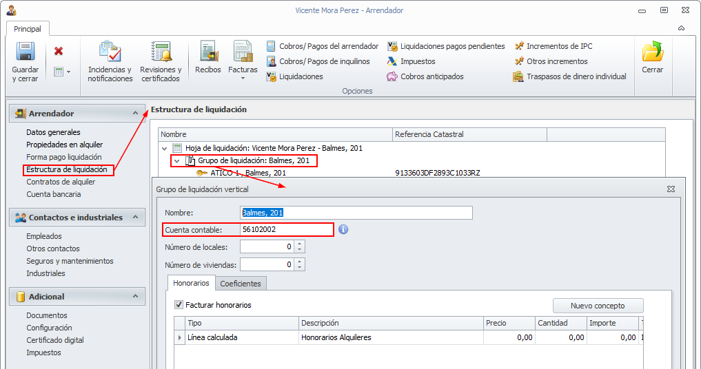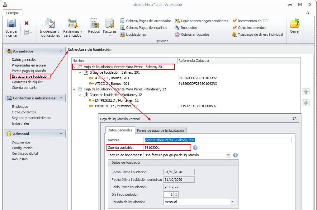 Las cuentas contables de fondos depositados (donde se contabilizan los recibos cobrados y los gastos pagados por cuenta del arrendador), en adminet se guardan en las hojas y grupos de liquidación. Las se puede ver en la sección Estructura de liquidación de la ficha del arrendador. Sólo serán visibles si tiene activado el enlace contable para el administrador, en la ficha de Empresa. Haga clic aquí para obtener más información acerca del enlace contable.