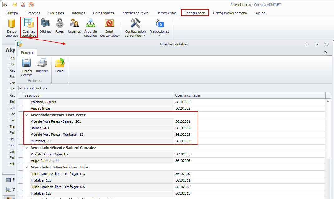 Si lo prefiere, también puede acceder al botón Cuentas contables del menú Configuración y consultar el conjunto de cuentas de fondos depositados de cada arrendador.