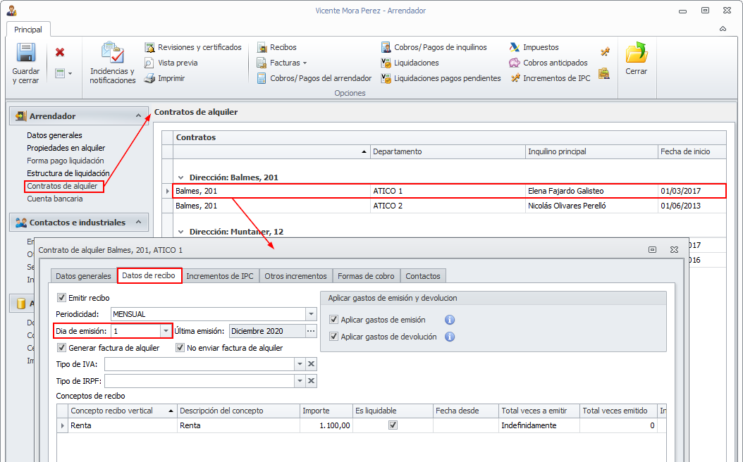 La comprobación debe realizarse accediendo a la ficha del arrendador y situándose en la sección Contratos de alquiler. Haciendo doble clic sobre un contrato se abre su ficha. En la pestaña Datos de recibo se encuentra la casilla Emitir recibo de ese inquilino.