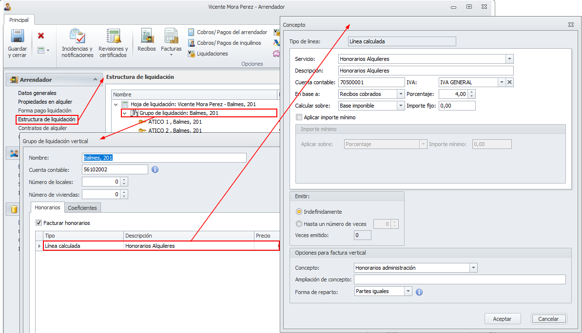 La comprobación debe realizarse accediendo a la ficha del arrendador y situándose en la sección Estructura de liquidación.
