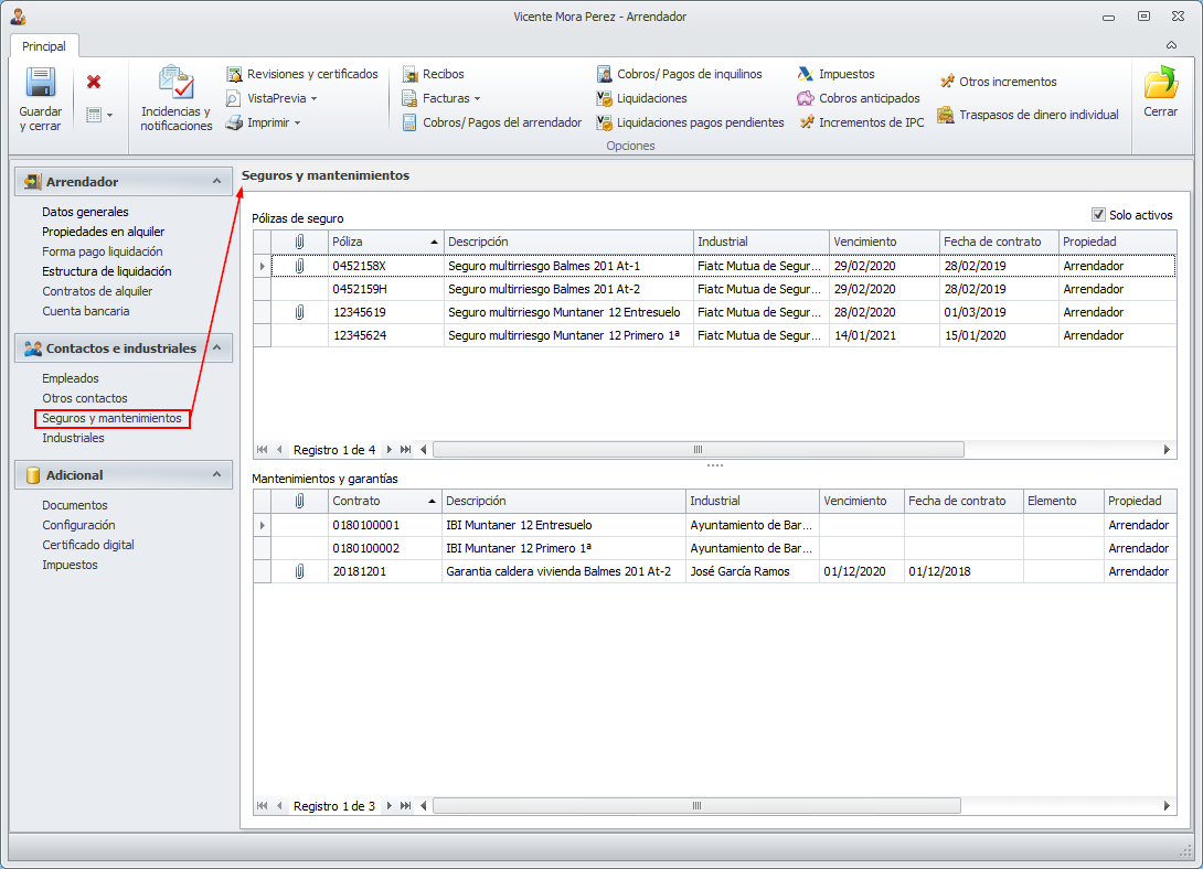 La comprobación debe realizarse arrendador por arrendador. Abra la ficha del arrendador y vaya a la sección Seguros y mantenimientos.